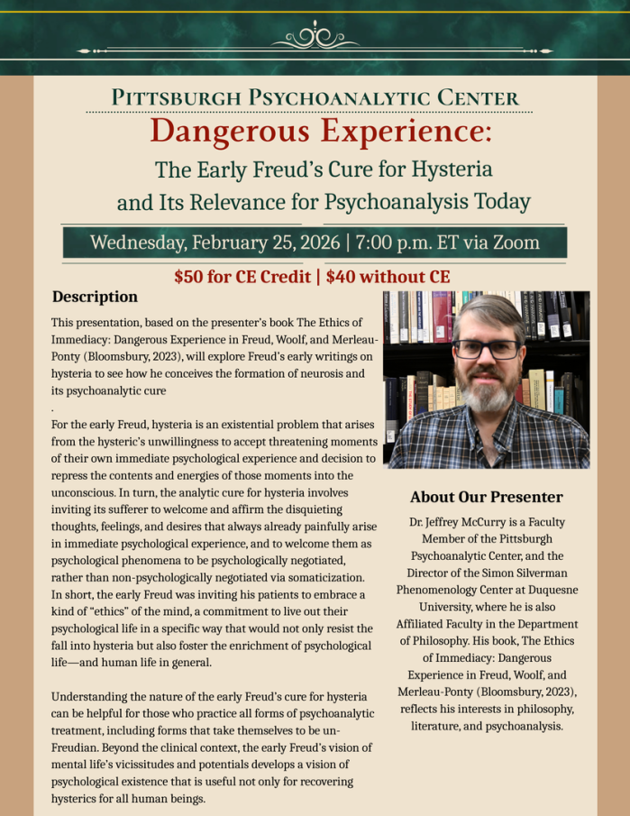 7PM - 9PM Pittsburgh Psychoanalytic Center Library 401 Shady Ave. Pittsburgh, PA 15206