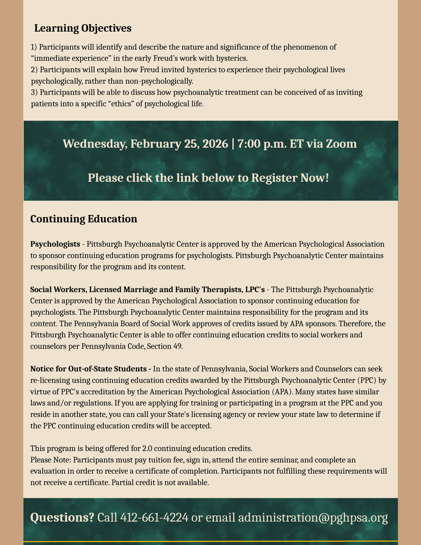 Pittsburgh Psychoanalytic Center is approved by the American Psychological Association to sponsor continuing education for psychologists. The Pittsburgh Psychoanalytic Center maintains responsibility for the program and its content.